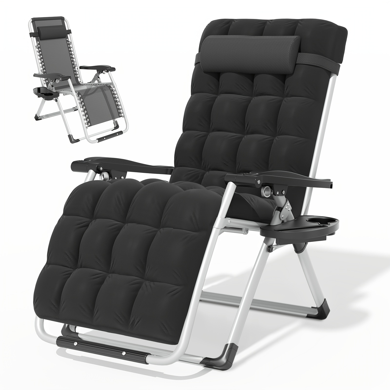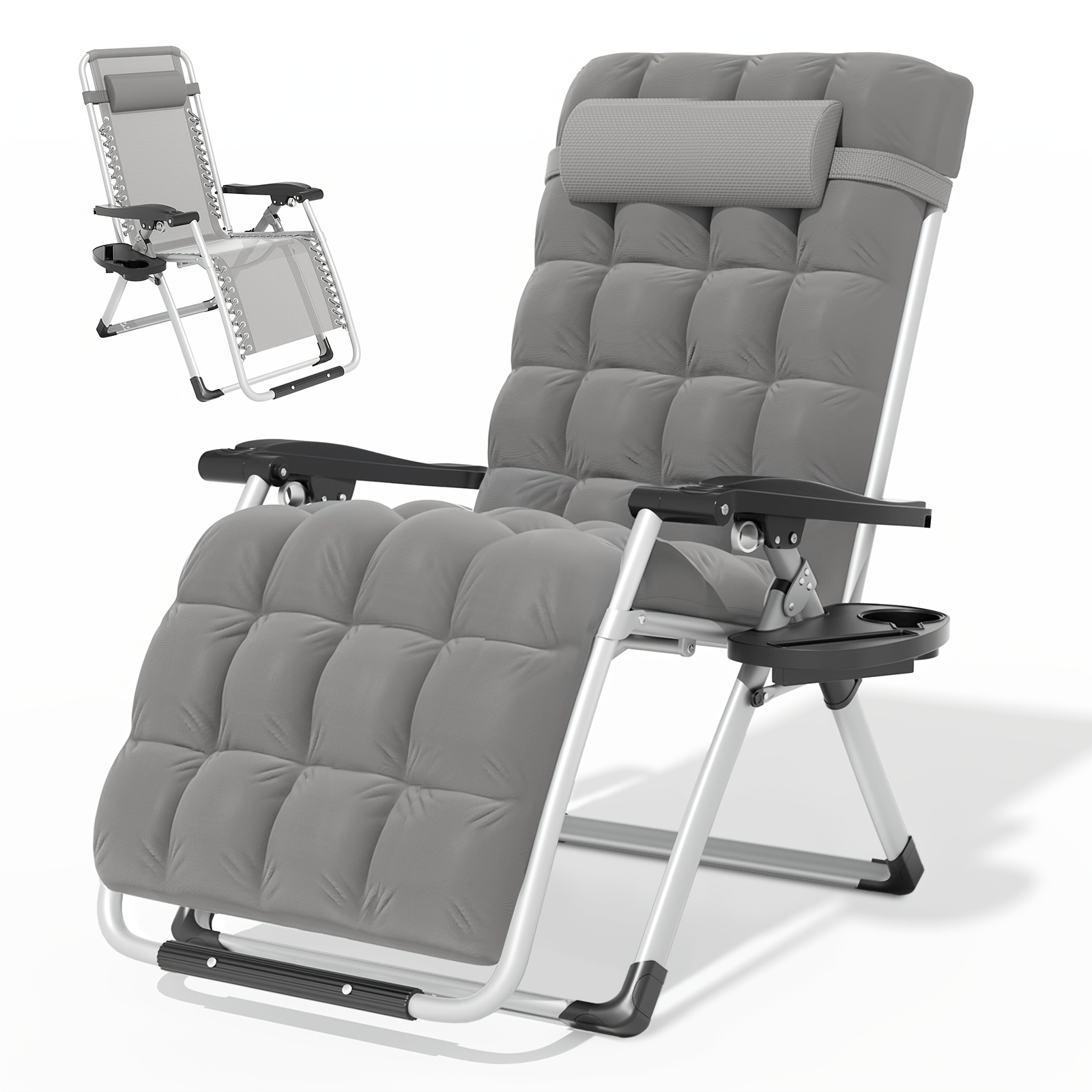 A Zero-Gravity Chair Featuring a Cushion, This Reclining Lounge Chair Is Suitable for Outdoor Patios. It Is a Foldable Indoor Anti-Gravity Recliner, Designed for Portability And Comes with a Detachable Cup Holder Side Tray And a Pillow Headrest
